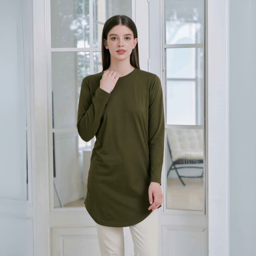 Crafted from soft and breathable 100% combed cotton, this T-shirt ensures you stay cool and comfortable all day long. Its material is cooling, gentle on the skin, and opaque—never thin or sheer. The long, loose-fitting (labuh dan longgar) cut provides modest coverage for daily activities, sports, and leisure, allowing you to move with confidence and ease.